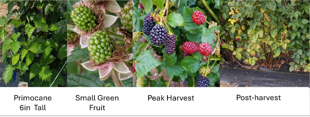 | Primocane 6-12″ Tall | Small, Green Fruit on Floricane | Peak Floricane Harvest | Post-Harvest | |